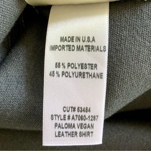 ▫️ Description: Made in the U.S.A. This long-sleeve shirt is designed with a pointed collar and snap button placket at the front. Crafted in soft vegan leather, this shirt is finished with patch pockets at the chest, a raw cut curved hem, and straddle stitch detailing.