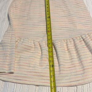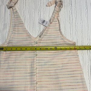 Chic sleeveless dress featuring tie straps and a button-down front. The dress has a subtle striped pattern in pastel colors. Drop waist with fun ruffle at hem. Great weekend day date outfit. Never worn. New with tags. Smoke free dog friendly home.