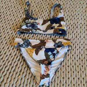 Bright yellow swimsuit with scalloped edges. Perfect for summer.