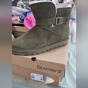 NEW! BearPaw Suede Olive Green Sheepskin Short Pull On Boots Size 11