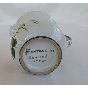 This is a vintage Italian studio pottery creamer pitcher with a colorful hand-painted floral design. The pitcher is made of ceramic material with a glossy finish and stands at 3.25 inches tall with a width of 3 inches. The backstamp is painted on the bottom and the item is signed by the artist. This original piece was crafted in Italy and is a perfect addition to any decorative cookware or dinnerware collection.