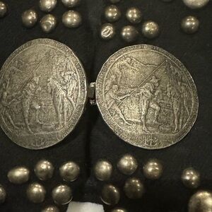 It features two large decorative vintage coin silver concho-style buttons at the front, enhancing its Western flair.