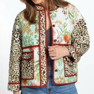 The jacket has a fitted waist and slightly flared hem, giving it a flattering, feminine shape.