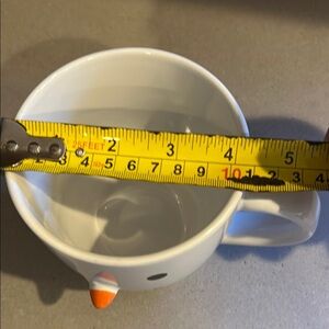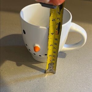 Charming snowman face design. White mug with orange nose. Perfect for winter drinks.