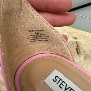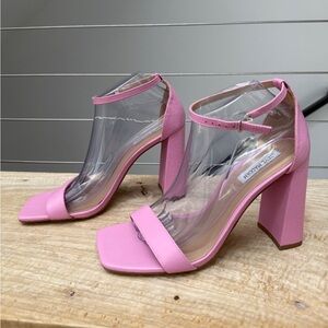 Add a pop of color to your wardrobe with these stunning Steve Madden block heel sandals in a bold bubblegum pink. Featuring a sleek patent leather finish, adjustable ankle strap, and a trendy open-toe design, these heels are the perfect combo of style and comfort.