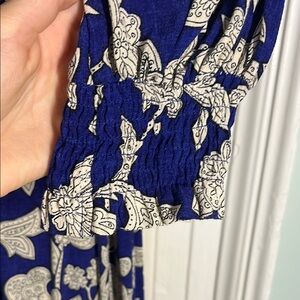 This stylish maxi dress from Zara features a scoop neckline and long bishop sleeves, making it ideal for a wedding guest. The blue and cream floral pattern enhances its elegant sundress style, while the flowing silhouette ensures comfort and grace.