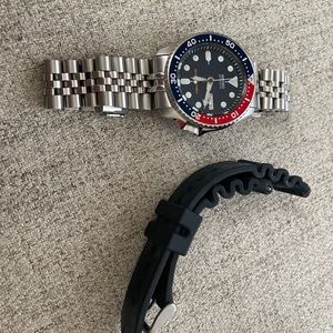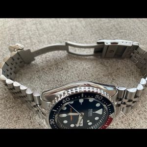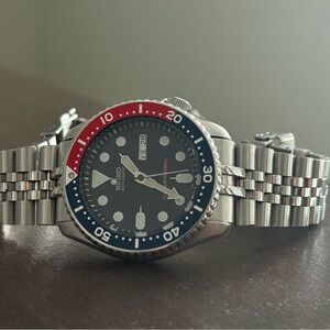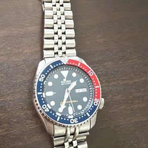 This Seiko dive watch features a striking blue dial complemented by a stainless steel bracelet, offering both style and durability. The watch's rotating bezel is designed for precision timing, making it an ideal accessory for diving enthusiasts. Its luminous hour markers ensure visibility in low-light conditions, enhancing its functionality.