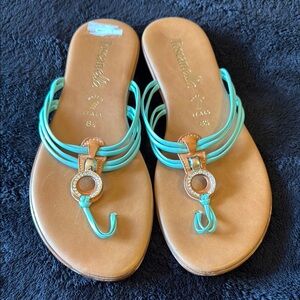 Step into style with women's sandals. Featuring a vibrant turquoise strap and a classic tan sole, these sandals offer both comfort and elegance. Perfect for any casual outing.
