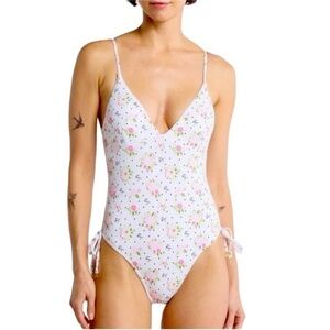 American Eagle "Garden Party" dress in a small floral print with elastic smocked waist, crossover neckline at front and back with hook and eye on the front and a tie at the top of the back. Eyelet embroidery on the sleeves and ruffles.