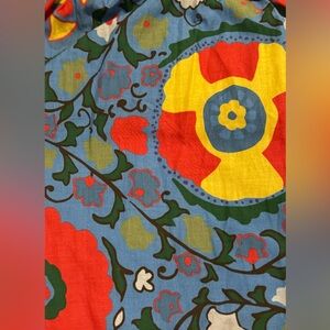 Vibrant blue with multi-colored floral design. It is pleated so the fit is loose and baggy but the braided belt (in same fabric design as dress) is long enough that it can be tied around the waist 3 times for a more cinched look and smaller bow. The photo shows me wearing it with the belt tied twice around the waist and bow 🤍 Perfect for any spring or summer occasion with flip flops or heels!