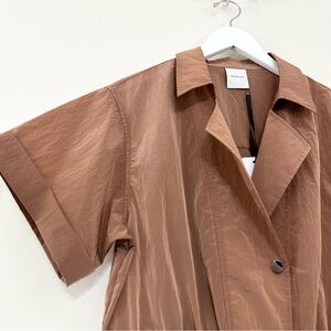 Designed for city strolling, this playsuit is cut to an exaggerated, oversized fit that cinches at the waist with a self-fabric belt. Complete with a revere collar, popper fastenings and wide, short sleeves, its crafted in crinkled nylon fabric, characterized by a beautiful metallic sheen.
