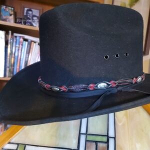 Stylish and versatile black cowboy hat perfect for any occasion. Crafted with attention to detail for a comfortable fit. With leather cowboy belt design hat band. 100% wool felt, gently worn only a few times. I've had it about 20 years and it has been in the closet for most of those years. Even the cows really loved it.