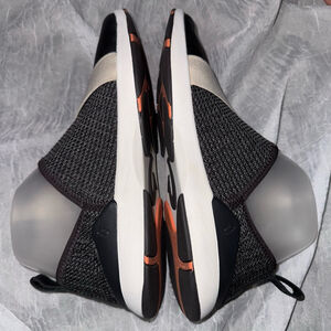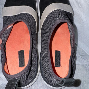 These are pre-owned OluKai Miki Slip-on shoes, size US Women's 7.5, EUR 37.5. The upper is constructed from leather and textile. They feature a black leather toe, gray woven fabric, and a beige elastic strap. The outsole is rubber, with a white midsole and orange and black tread. In Like New Condition . The shoes are slip-on style with a pull tab at the heel.