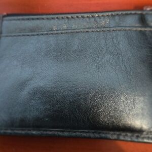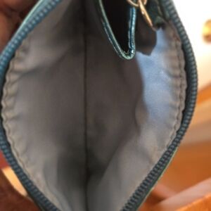 Crafted by the renowned Coach brand, this Turquoise Metallic Key Chain Coin/Card Wallet is a petite yet practical accessory for women. It showcases a chic zip style, complemented by the elegance of its metallic turquoise leather, which adds a pop of color to your everyday Like New Condition