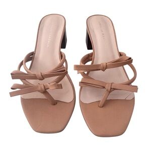 Loeffler Randall Leather Bow Strap Jean Sandals. Loeffler Randall's nude Jean mule style sandals are crafted from nappa leather with two delicate bow embellishments. They're set on a stacked 2” block heel that's just tall enough to provide a bit of height without compromising comfort. Slip yours on with a midi dress to show off a fresh pedicure. Size 8. Small scratch/tear on left shoe (see pics) otherwise excellent condition. Smoke free home. Fast shipping.