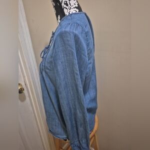 This elegant blouse from Talbots features a chic tie front and smocked detailing, complemented by a stylish bib collar and 3/4 sleeves. The soft blue hue adds a touch of sophistication, making it a versatile addition to any wardrobe.