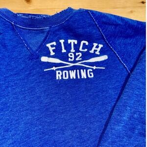 Abercrombie & Fitch sweatshirt, a stylish and comfortable addition to your casual wardrobe. This blue sweatshirt features a classic crew neck and long sleeves, perfect for layering or wearing on its own. The front showcases a "Fitch 92 Rowing" graphic with crossed oars, adding a sporty touch. The sweatshirt has a muscle fit, providing a more tailored silhouette. The collar, cuffs, and hem have a distressed, raw-edge finish, giving it a vintage-inspired look.