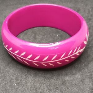 This eye-catching bracelet features a vibrant pink base adorned with intricate white floral and leaf motifs. Crafted from durable resin, it boasts a smooth, rounded profile that adds a touch of bohemian charm to any outfit.