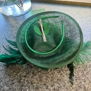 This elegant green hat showcases a stunning fabric flower with layered petals, complemented by soft, wispy feathers for added texture. Its vintage-inspired design makes it a perfect accessory for special occasions.