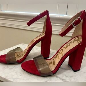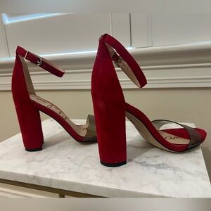 These Sam Edelman heels feature a striking red suede and smoky grey strap with a chunky heel and a minimalist design. The ankle strap with buckle closure ensures a secure fit, making them perfect for formal occasions. The bold red hue adds a touch of elegance to any outfit.