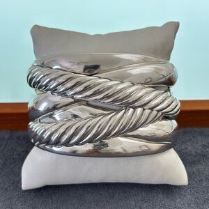 David Yurman sterling silver wide sculpted cable cuff bracelet. Excellent preloved condition! Recently cleaned and professionally polished to high shine. Retail price $1,450+