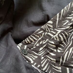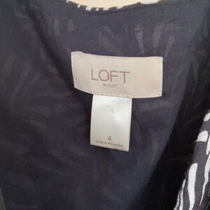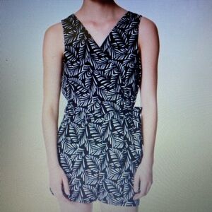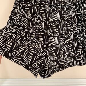 Loft palm leaf print romper. Black with white leaves. Wrap crossover style to top that ties into place at waist. Button closure on inside of wrap. V-neck. Pockets. Zipper fly. Elastic waist. Like new condition.