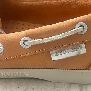Step into style with Sebago classic tan boat shoes. Perfect for any casual outing, these shoes offer comfort and durability.