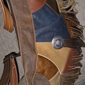 Color: color blocked with tan, brown, black, blue