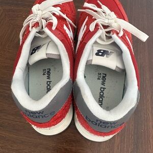 Stylish New Balance athletic shoes. Vibrant red with white accents. Comfortable and durable design.