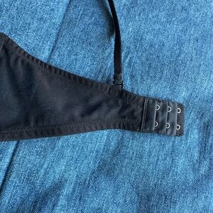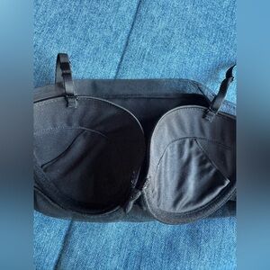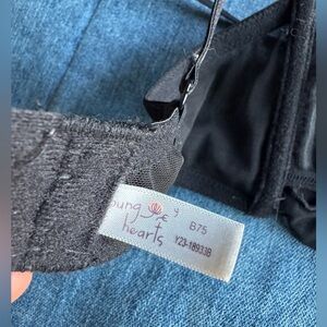 Stylish black bralette with a sheer overlay. Perfect for layering. Molded cups, adjustable back strap. Super cute! No flaws, great condish. Size B75, not sure what metric that is but I’d say fits like a 34B