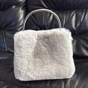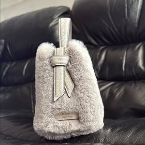 This chic mini bag by Kate Spade features a plush gray texture, offering a cozy yet sophisticated look. Its compact size and structured design make it perfect for evening events or as a stylish accessory. The metallic handle adds a modern touch, ensuring it stands out in any setting.