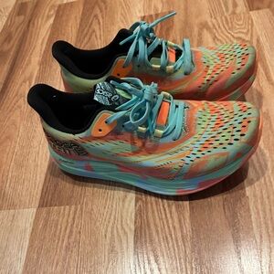 Dynamic ASICS sneakers with a striking green and orange pattern. Ideal for sports and active wear.