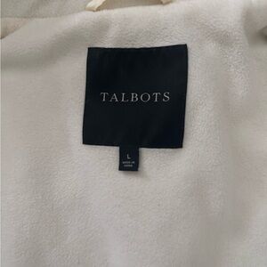 This warm off-white quilted vest from Talbots features a classic diamond pattern and a stand-up collar, offering a stylish and versatile layering option. Fleece lined interior with additional warmth. Zipper front with button closure. In excellent condition, non-smoking/non-fur household.