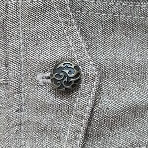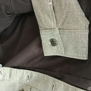 Chico's Gold/Brown Denim Jacket with Embroidery Sz Chico's 1 (Sz 8 or small) Gorgeous gold and brown tones with gold metallic details Beautiful buttons pockets Cotton, metallic, spandex fully lined wear dressy or casual, just beautiful Pit to pit 21 Length 23 Like new /G W9.5