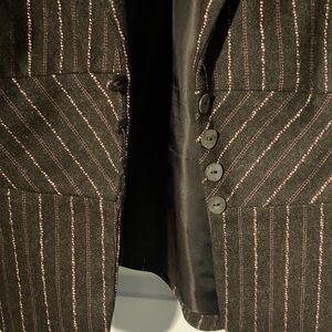 Elevate your style with this chic brown striped blazer. Button it up for a cinched waist with peplum flare. Completely lined. Perfect for any occasion, this jacket adds a touch of sophistication to your wardrobe.