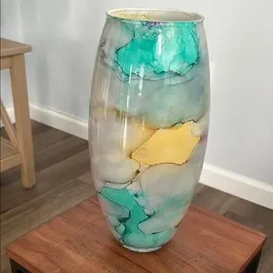 Beautiful glass vase with abstract design. Features yellow, teal, and purple accents.