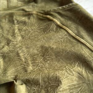 Excellent gently used condition. There are no visible signs of wear on this garment. Stylish olive green oiled/distressed leggings. Features side pockets and 5 pockets on the waist line. Perfect for active wear anywhere.