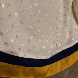 Lucyparis gold dot blouse. Beautiful detail with shiny gold dots and navy trim.sleeves hit at elbow and length falls at hips on 5’7” frame. So cute for a night out!