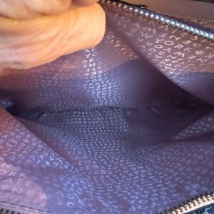 Three part handbag has two zip pockets on either side of center compartment with zip interior pocket