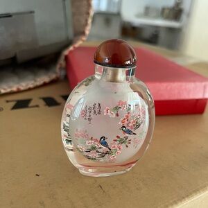 A Chinese perfume or cologne bottle, with inner design carefully painted on the inside of the glass using a fine paint brush. Words I believe say something like sweet like flower. Dimensions 2 in tall.