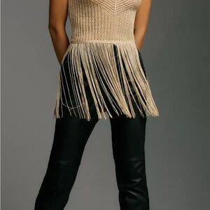 This Anthropologie top features a captivating fringe detail that adds dynamic movement and texture to its design. The fitted bodice in a goldish tone complements the flowing tassels, creating a striking visual appeal. Perfect for making a statement, this top effortlessly combines elegance with a touch of drama.