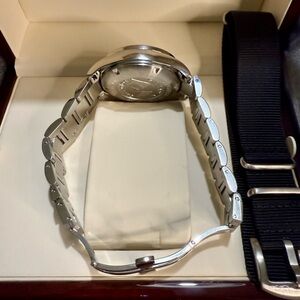 WR to 50 meters. Comes with Extra NATO Strap. Box Manual & *Card for registration with invoice*.