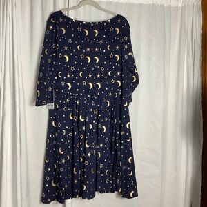 This Unique Vintage sundress features a striking blue and gold color palette with a bateau neckline and 3/4 sleeves. The playful celestial print adds a touch of whimsy, while the soft, stretchy fabric ensures comfort for casual outings. 38 inches long, 22” across waist. Hidden back zipper.
