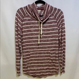Stylish knit top with burgundy and white stripes. Features a cozy cowl neck. Ideal for casual outings.