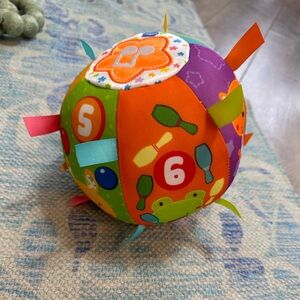 The Vtech Lil' Critters Roll Discover Ball is a bright ball that can be tossed, shaken, and rolled to hear cheerful music and sounds. It has playful animal characters and soft textures to encourage exploration. The big Star button introduces numbers and animals