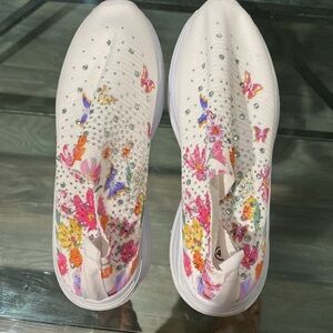 NWT: Step into style with these new floral embellished slip-on sneakers. Featuring a vibrant mix of colors, these shoes are perfect for adding a pop of color to any outfit. Enjoy comfort and fashion combined.