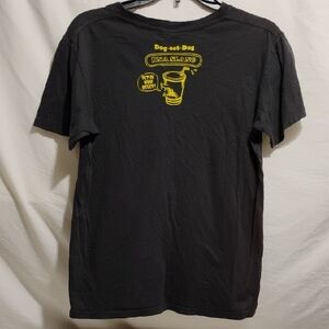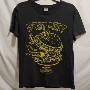 RARE! UNISEX! BEAT FEET Dog Eat Dog RNA The Alternative Slang vintage single Stitch tee shirt!! This short sleeve tee showcases a striking black base with a vibrant yellow graphic design. The fun and casual hamburger illustration, complete with the 'BEAT FEET' text, stands out beautifully against the dark fabric. Ideal for adding a pop of color to your casual wardrobe.