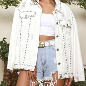 Chic gray denim jacket with studded accents. Features button closure and front pockets. Oversized Fit 23 PTP. New Without Tags