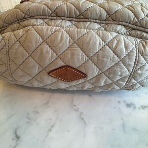 This MZ Wallace backpack has been well worn and used. It is in clean condition. Normal wear and tear but no damage. The color is like a light gray color. Comes with a medium sized pouch.