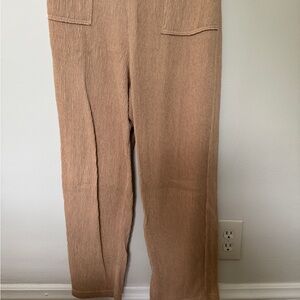 Relaxed ribbed knit jumpsuit by Free People Beach. V-neck relaxed fit tan sleeveless jumpsuit with collar. Perfect for any occasion, great for layering over a swimsuit or bra top.